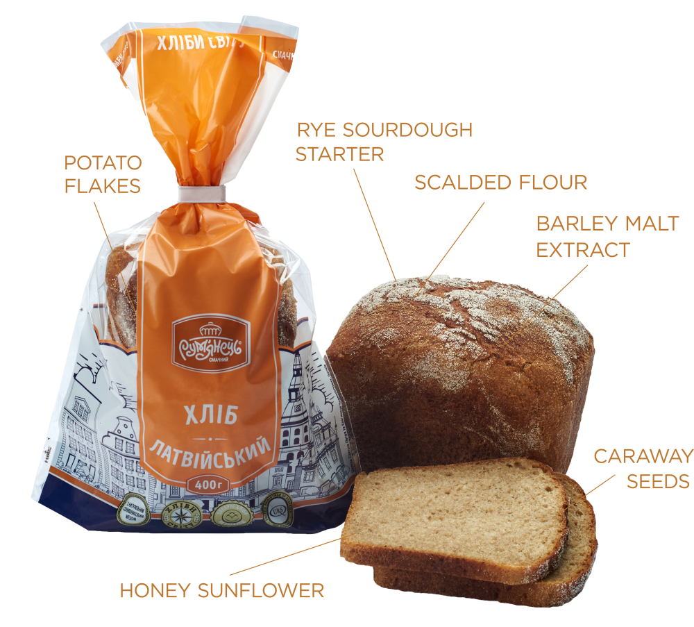 Ingredients: first-grade wheat flour, drinking water, peeled rye flour, rye bread leaven, sugar-glucose syrup “Leipomo”, potato flakes,barley malt extract (dark), compressed baker’s yeast, table salt, caraway seeds, sunflower honey.