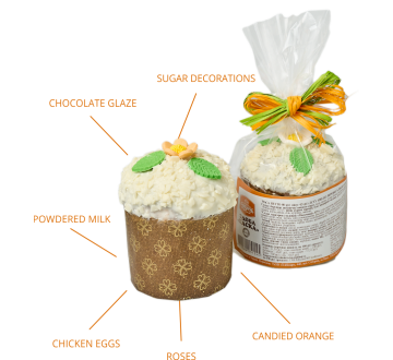 Paska (Ukrainian Easter Bread) that tastes like homemade, because we bake it according to traditional recipe. It has delicate crumb with a slight creamy flavor. Bright accents are added with candied oranges which gives the taste of light sweet and sour notes. For its decoration we used a delicious white chocolate glaze, chocolate crumbs and sugar flowers, soft as spring itself.