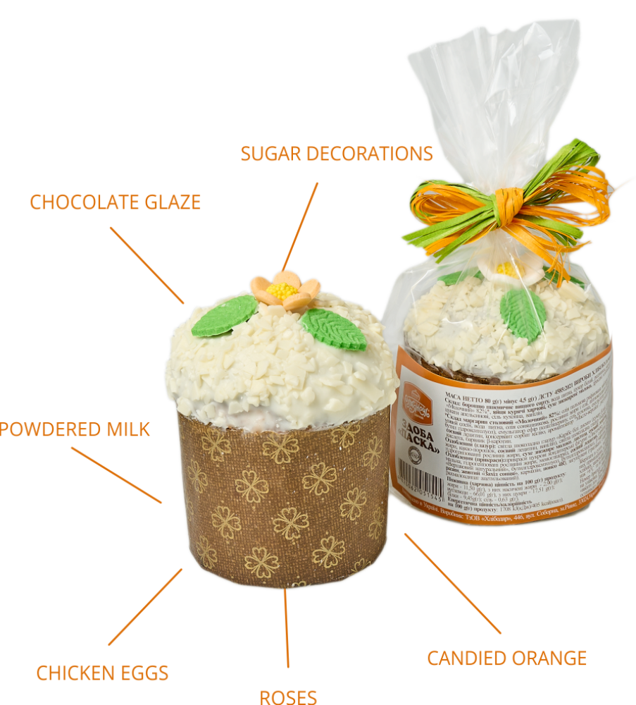 Paska (Ukrainian Easter Bread) that tastes like homemade, because we bake it according to traditional recipe. It has delicate crumb with a slight creamy flavor. Bright accents are added with candied oranges which gives the taste of light sweet and sour notes. For its decoration we used a delicious white chocolate glaze, chocolate crumbs and sugar flowers, soft as spring itself.