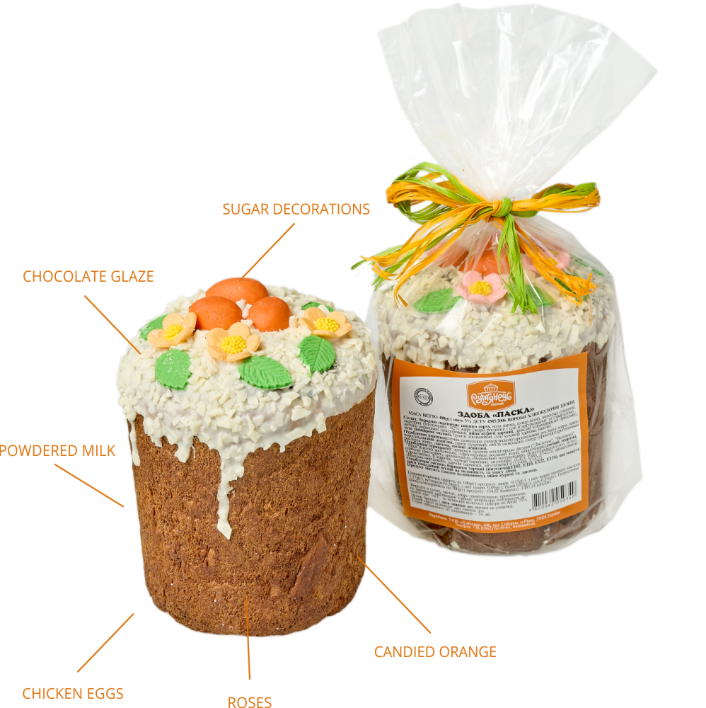 Paska (Ukrainian Easter Bread) that tastes like homemade, because we bake it according to traditional recipe. It has delicate crumb with a slight creamy flavor. Bright accents are added with candied oranges which gives the taste of light sweet and sour notes. For its decoration we used a delicious white chocolate glaze, brightly coloured chocolate Easter eggs and sugar flowers, soft as spring itself.