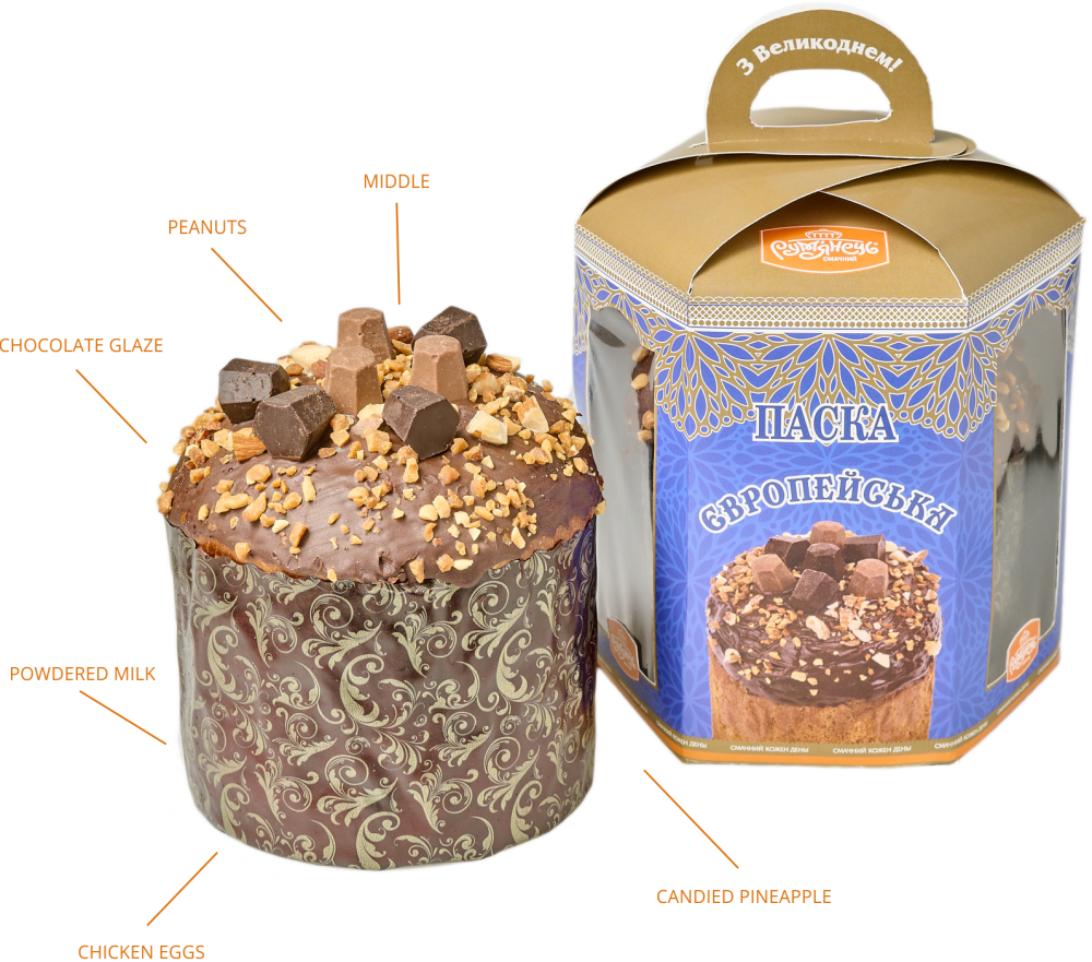 Paska with an original refined taste. Candied pineapple and raisins perfectly complement fluffy soft dough. Having tasted a piece of this Easter Bread, you will feel light vanilla and orange notes that add extra zest to its taste. The decoration of the European Paska, made of dark chocolate glaze in combination with crushed almonds, creates bright taste accents. Delicious dark and milk chocolate candies are a perfect match to the festive look of this Easter Bread.
