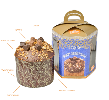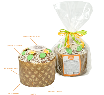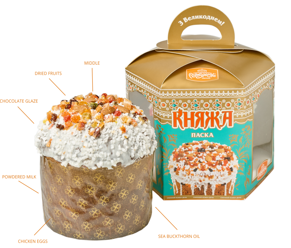 Thanks to original recipe and special combination of ingredients, our Kniazha Paska (Ukrainian Easter Bread) has a truly rich and refined taste. Fluffy soft crumb with a delicate creamy taste is generously filled with candied fruit, raisins and dried fruits. A small amount of buckthorn oil is added into the dough to make the Paska taste specially. White chocolate glaze is generously used for the decoration. We decorate the top of it with delicious candied fruit and almonds, which gives it a rich taste. This is a true royal Easter Bread.