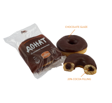 ТУ У 15.8-33358979-003:2008 Ingredients: highest-grade wheat flour, mix for doughnuts (15%), Iris filling (30,6%), yeast, sugar, margarine, eggs, water, sugar powder.
