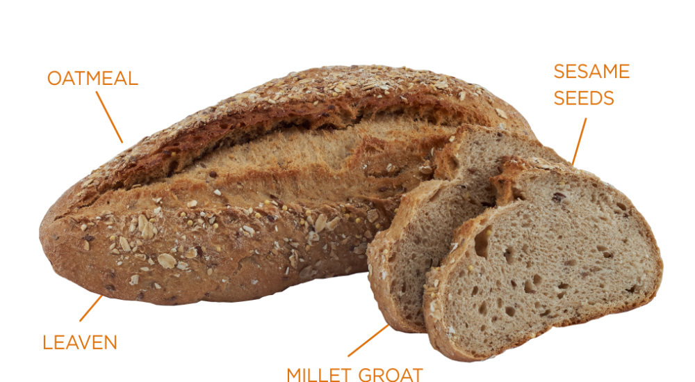 A blend of whole wheat and rye flour on rye sourdough starter is a perfect base for a delicious and healthy bread. But our technologists made this bread even more nutritious by adding oatmeal flakes, flax seeds, sunflower seeds, millet and white sesame seeds to it. The more cereals are, the more useful is the product! Bread containing a mix of whole grain cereals has its delicate taste and works well with any dish.