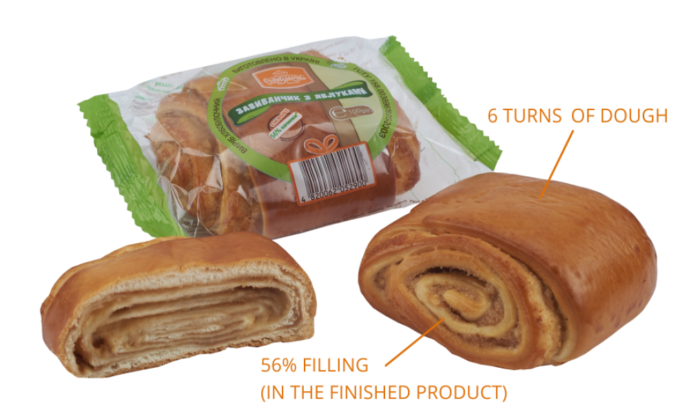 Our classic Apple Zavyvanets in a smaller size to be a snack on the go. It traditionally has six very thin swirls of delicate dough and lots of aromatic apple filling. The ideal weight is 100g in a comfy individual packaging. This Apple Roll will make a great option as a snack with your favourite tea, coffee, yogurt or fresh juice. Make your own choice of a drink to it.