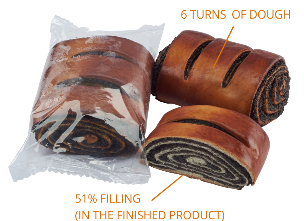 Filling: poppy seed filling “Exclusive”- 66% (poppy seed 45%, sugar, water, corn molasses, deodorized frozen sunflower oil brand “P”, stabilizer vegetable fibers, preservative potassium sorbate), drinking water, breadcrumbs, chicken eggs, white sugar, milk margarine 82%, apple pectin.