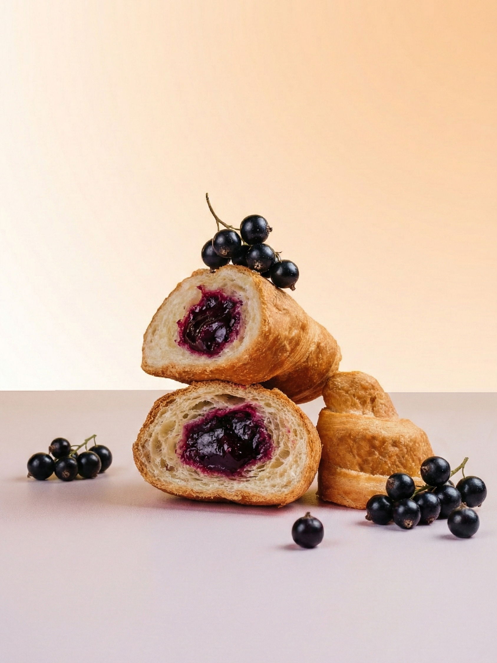 Її легка терпкість і насичений аромат створюють глибокий смаковий профіль, який чудово поєднується з ніжною текстурою листкового тіста. Смородиновий круасан стане ідеальним вибором для поціновувачів яскравих ягідних смаків. Він не перевантажує солодкістю, залишаючи відчуття свіжості і гармонії.