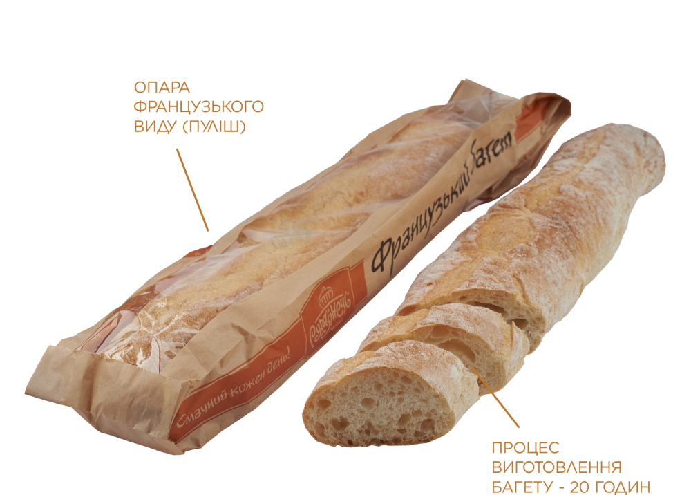 Наш французький багет створений з дотриманням традиційних французьких технологій. В його основі рідка холодна опара – пуліш, тож процес виготовлення наших французьких багетів займає близько 20 годин. Пуліш робить багет надзвичайно хрустким, пористим і рустикальним, як у традиційних перкарнях Франції.