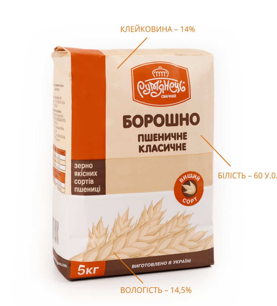 Якісне борошно вищого ґатунку із золотих зерен м’якої пшениці, яка булавирощена на наших українських полях. З української пшениці виходить справжнє сильне борошно, з якого легко зробити пухке пористе тісто з відмінним смаком. Борошно від ТМ «Рум’янець» універсальне, тож чудово підходить для різних видів випічки та як інгредієнт до різноманітних страв.