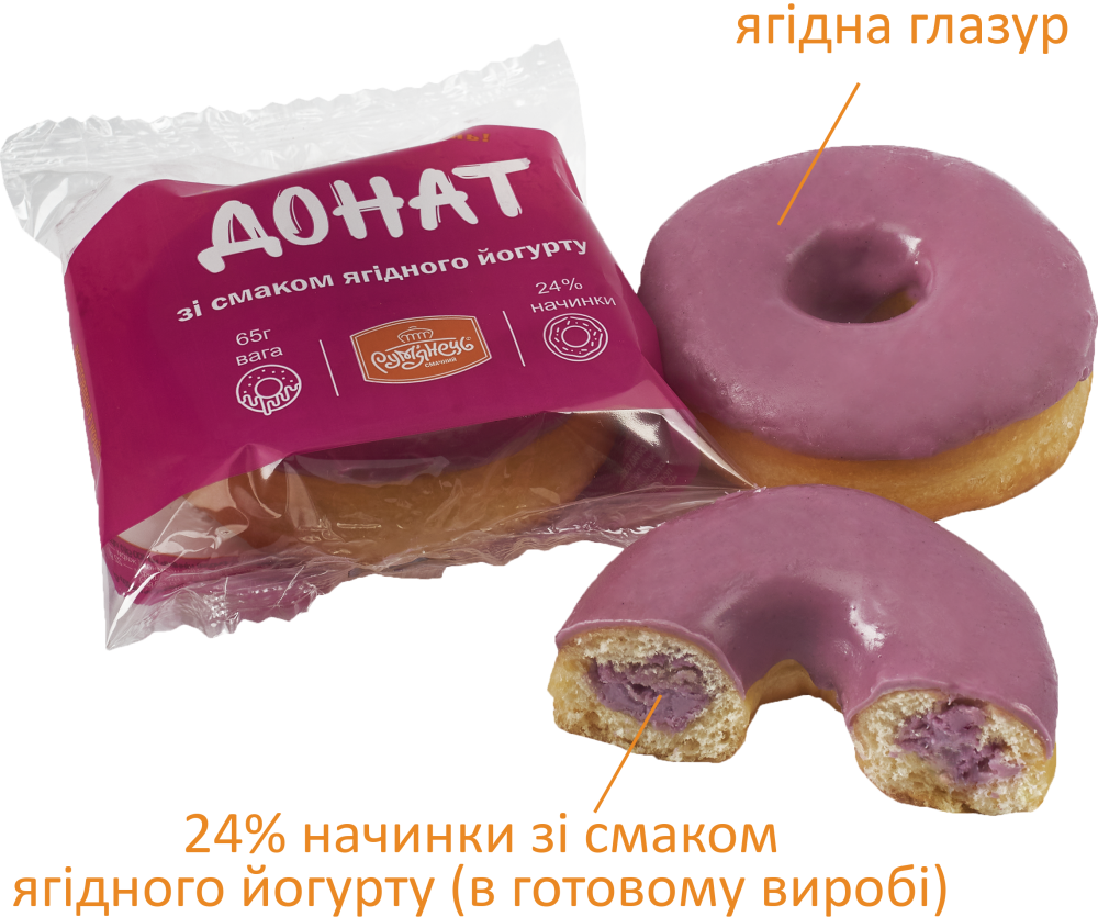 Ніжний донат зі смаком ягідного йогурту створений, щоб робити ваші миті солодшими і незабутніми. Кожен укус переповнений йогуртовою начинкою з насиченим смаком ягід, яка тане в роті, підкреслюючи свіжість і елегантність цього десерту.