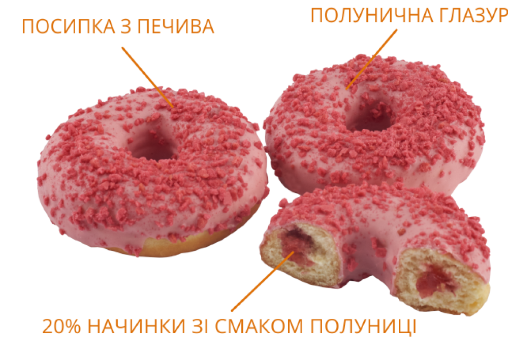 Склад: борошно пшеничне вищого сорту, наповнювач ягідний гетерогенний «Полуниця» (20%), вода, рафінована дезодорована рослинна олія «Fritex 15», цукор, хлібопекарський поліпшувач «Донат 8%», маргарин «Молочний 82%», дріжджі, сіль.