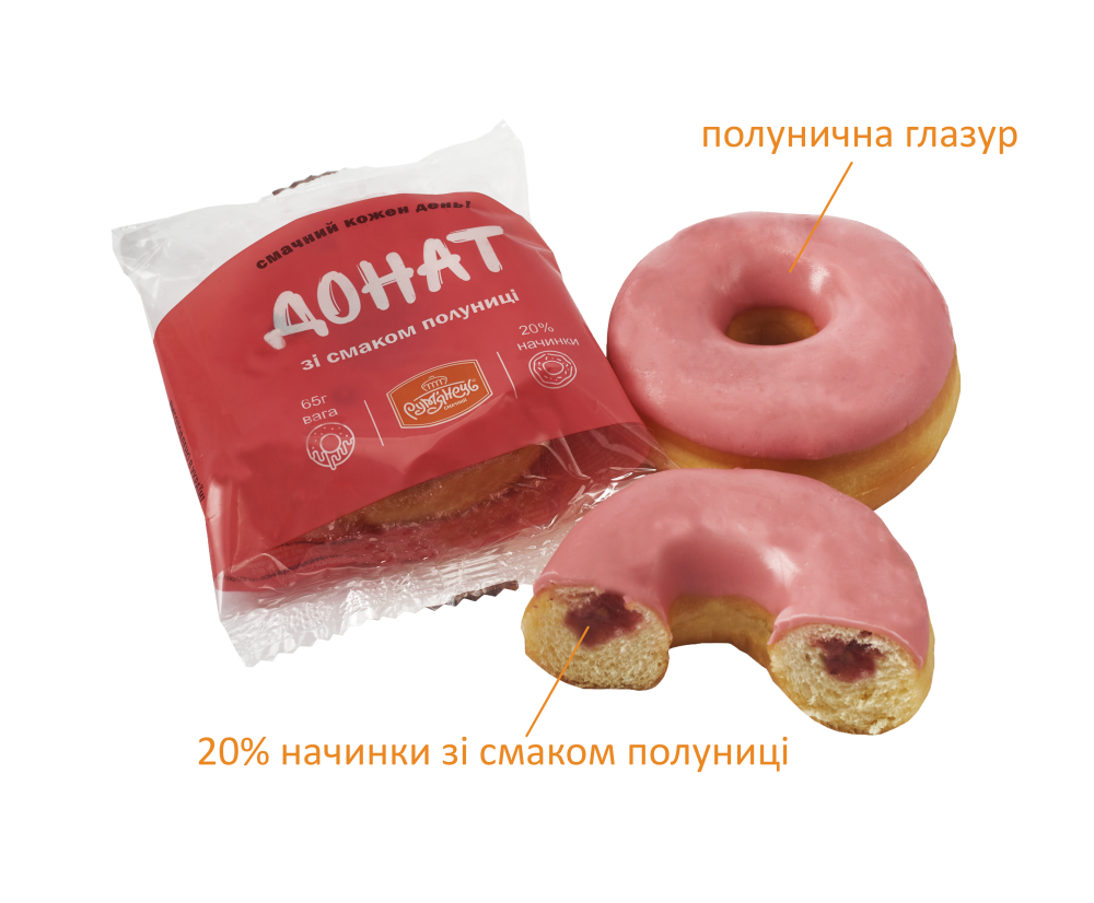 Склад: борошно пшеничне вищого сорту, наповнювач ягідний гетерогенний «Полуниця» (20%), вода, рафінована дезодорована рослинна олія «Fritex 15», цукор, хлібопекарський поліпшувач «Донат 8%», маргарин «Молочний 82%», дріжджі, сіль.