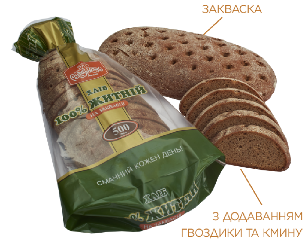 Справжній житній хліб виготовлений з житнього обдирного борошна. Ми робимо цей хліб на живій житній заквасці, яка допомагає розкрити усі корисні властивості житнього хліба. Наш «100% житній» має щільний дещо вологий м’якуш та насичений житній смак з легкою кислинкою, яку вдало доповнюють пряні нотки гвоздики та кмину.