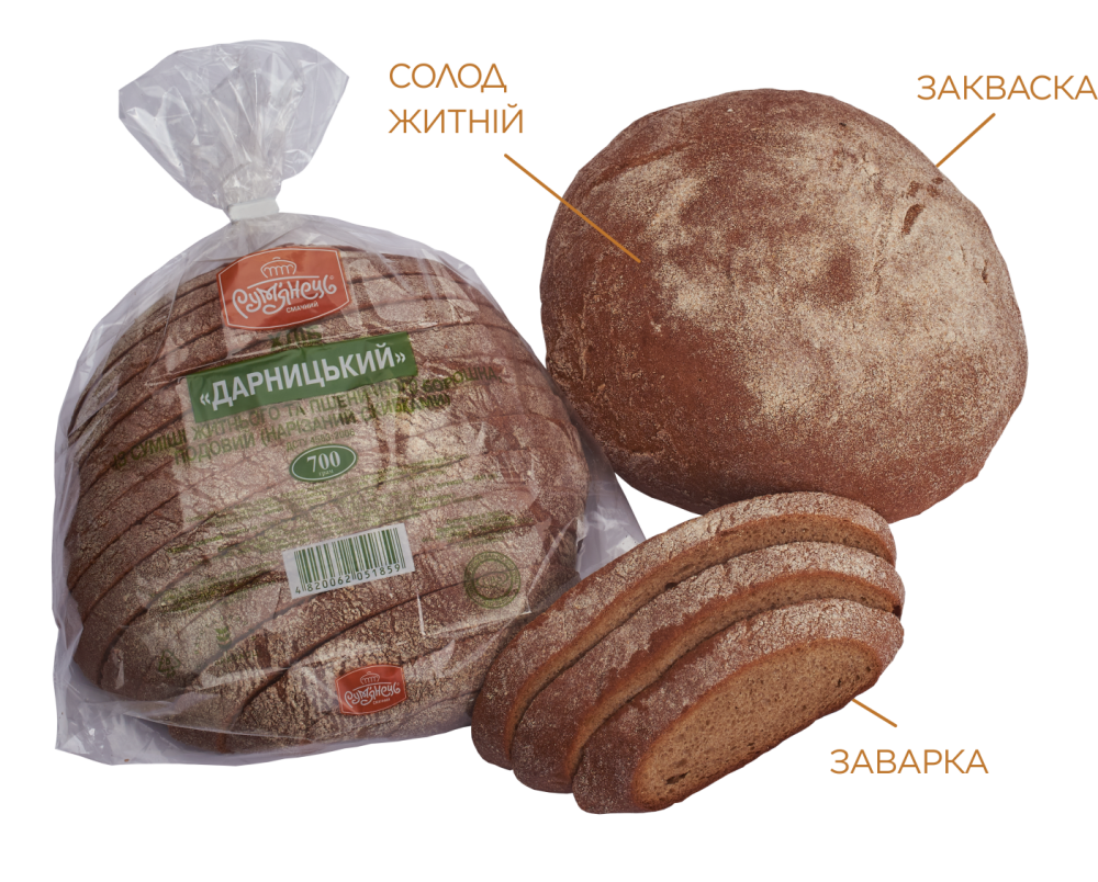 Один із найпопулярніших і найулюбленіших в Україні житньо-пшеничних хлібів. Ми виготовляємо його на заквасці та житній заварці, які допомагають розкрити особливий смак поєднання трьох видів борошна. Довершує рецептуру житній солод, завдяки якому цей хліб має знайомий з дитинства легкий кисло-солодкий смак.