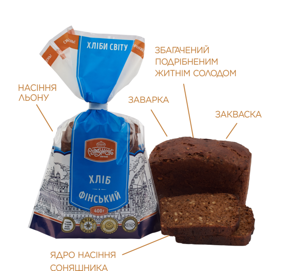 Найпівнічніша рецецептура у нашій колекці «Хліби світу». Житньо-пшеничний заварний хліб, виготовлений на живій житній заквасці, яка є обов’язковою для традиційного фінського хліба. Окрім того, для фінської кухні важливою є висока поживна цінність продуктів, саме тому ми збагатили свій «Фінський» насінням соняшника, подрібненим житнім солодом та насінням льону. Такий хліб не лише дуже корисний, а й має яскравий нордичний хлібний смак.