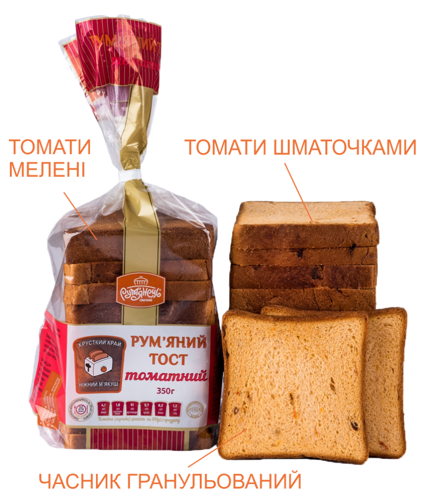 Склад: борошно пшеничне вищого сорту, вода питна, суміш суха хлібопекарська (пудра цукрова, клейковина пшенична суха, сіль харчова, борошно пшеничне, емульгатори моно та дигліцериди жирних кислот, стеараїллактилат натрію, борошно соєве, солод пшеничний, антиоксидант аскорбінова кислота, ферменти), маргарин, прянощі томати сушені шматочками (3,95%), дріжджі хлібопекарські пресовані, цукор, прянощі томати сушені мелені (1,3%), часник гранульований.