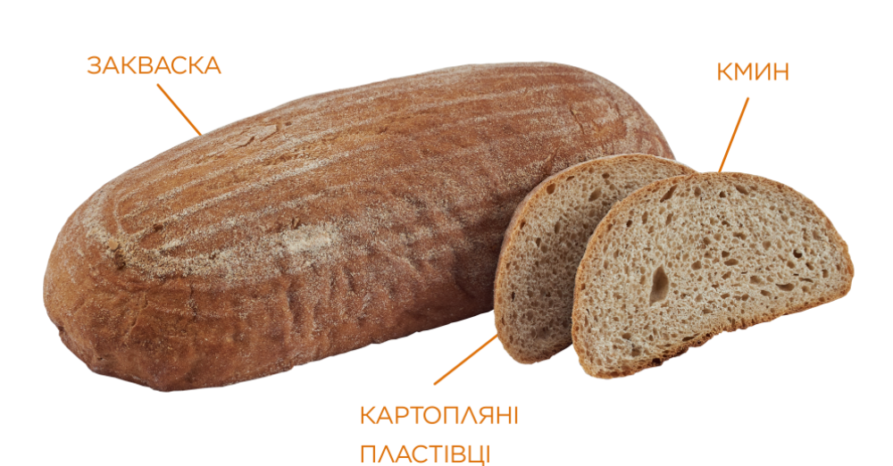 На українському столі хліб і страви з картоплі завжди займали особливе місце, саме тому ми створили хліб який об’єднує наші гастрономічні традиції. Особливий житньо-пшеничний хліб, виготовлений на заквасці з додаванням картопляних пластівців та картопляного пюре. Він має приємний житній смак, доповнений пряними нотками кмину.