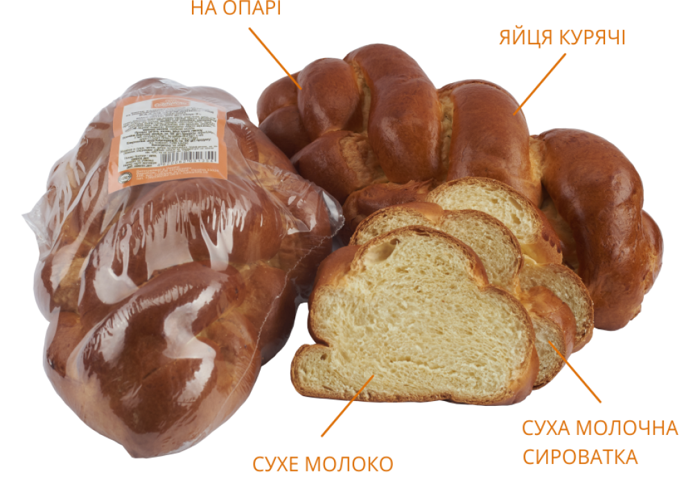 Склад: борошно пшеничне вищого сорту, вода, цукор, маргарин, яйця курячі, дріжджі, сіль, сухе молоко, суха молочна сироватка, ванілін.