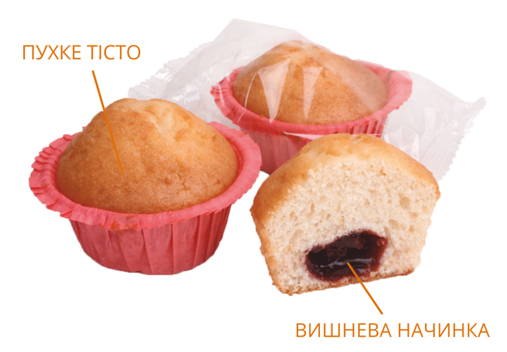 Склад: борошно пшеничне вищого сорту, цукор, яйця курячі, наповнювач фруктовий «Вишня», вода, суміш «Маффінмікс 25 Лайт», олія соняшникова, сіль.