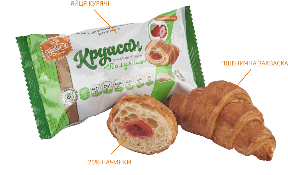 Склад: борошно пшеничне вищого сорту, наповнювач «Полуниця» (25%)*, маргарин для слоїння, вода, цукор, дріжджі, маргарин «Молочний 82%», молоко сухе знежирене, поліпшувач хлібопекарський, сіль, клейковина пшенична суха, закваска пшенична рідка.