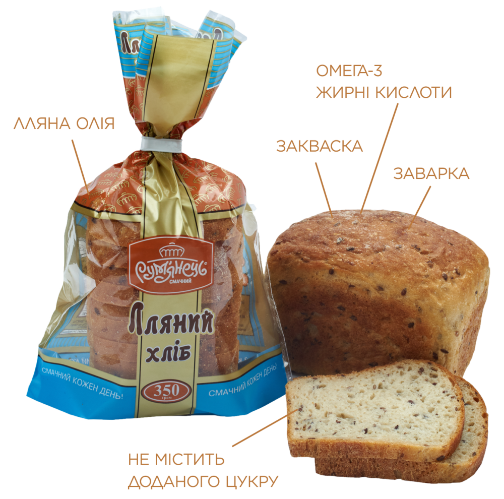Справжній заварний пшеничний хліб зробити ще кориснішим і смачнішим, якщо додати зернятка льону. Саме так з’явився наш хліб «Лляний» – улюбленець прихильників здорового харчування. Завдяки заварці цей хліб повністю розкриває природні корисні властивості якісного пшеничного борошна першого сорту. Він має надзвичайний духмяний аромат та солодкуватий присмак, хоч і взагалі не містить доданого цукру. Насіння льону, яке ми щедро додаємо до цього хліба, збагачує його омега-з жирними кислотами та створює яскраві смакові акценти.