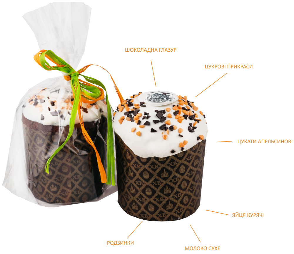 Склад: борошно пшеничне вищого сорту, вода, цукор, родзинки, маргарин, яйця курячі, сухе молоко, дріжджі, апельсинові цукати, сіль, ванілін.