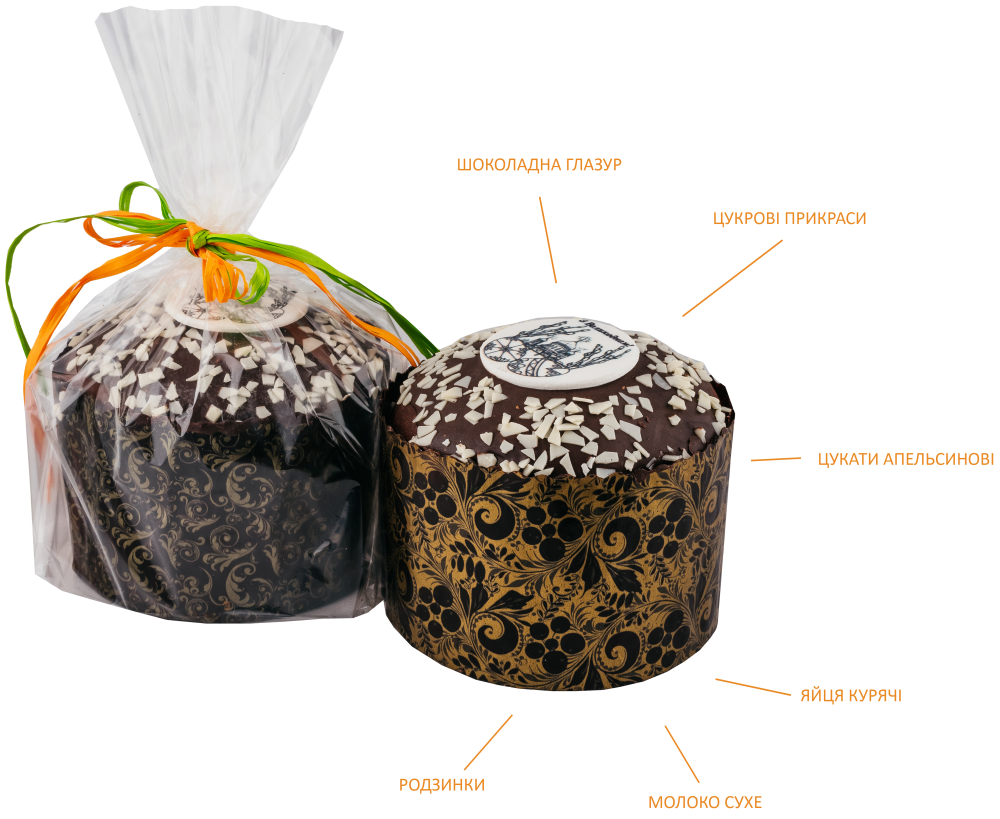 Склад: борошно пшеничне вищого сорту, вода, цукор, родзинки, маргарин, яйця курячі, сухе молоко, дріжджі, апельсинові цукати, сіль, ванілін.