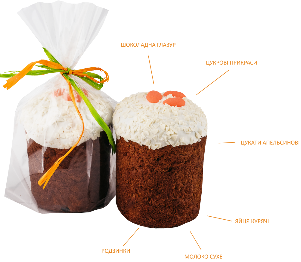 Склад: борошно пшеничне вищого сорту, вода, цукор, родзинки, маргарин, яйця курячі, сухе молоко, дріжджі, апельсинові цукати, сіль, ванілін.
