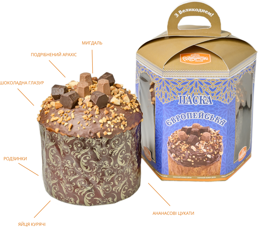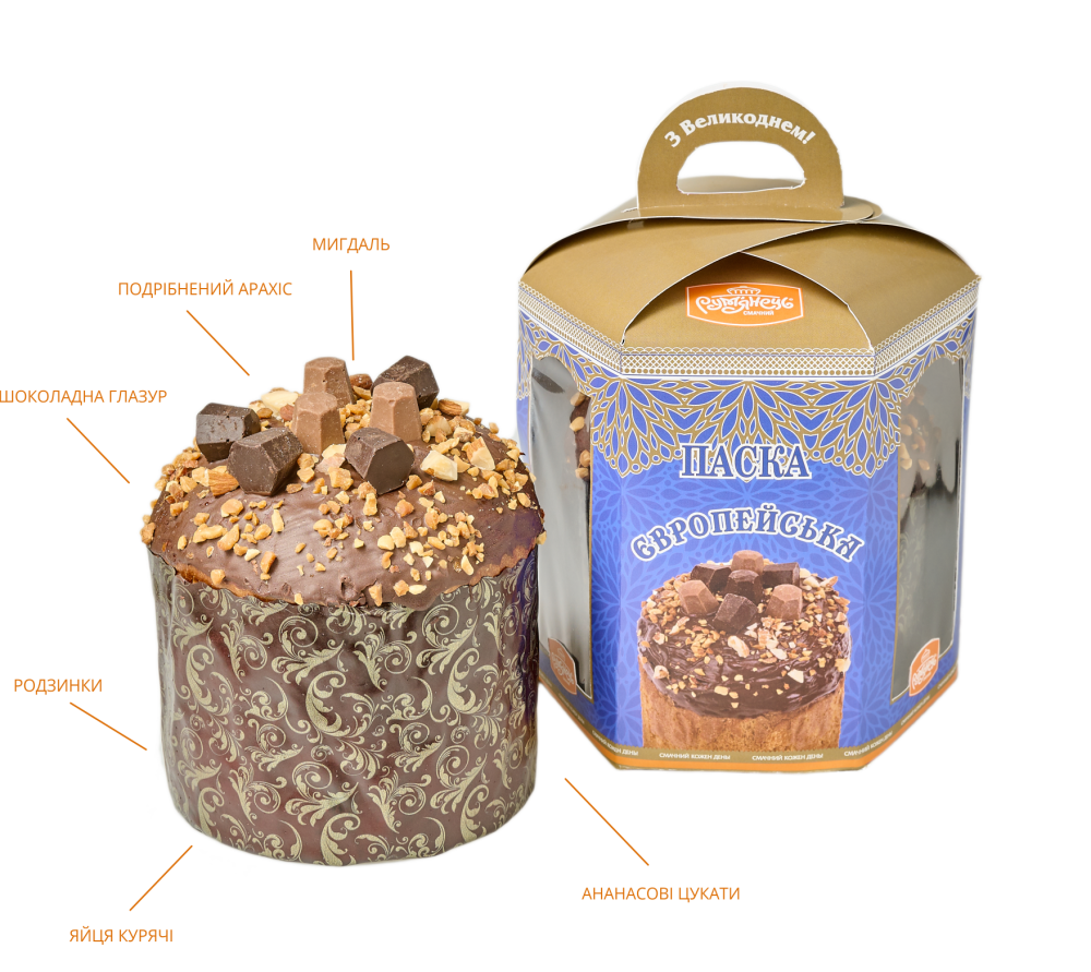 Паска з оригінальним вишуканим смаком. Пишне м’яке тісто з легкими вдало доповнюють ананасові цукати та родзинки. Скуштувавши шматочок, ви відчуєте легкі нотки ванілі та апельсину, які вдало доповнюють смак. Оздоба паски, з чорної шоколадної глазурі у поєднанні з шматочками подрібненого мигдалю, створює яскраві смакові акценти. Вишукані цукерки з чорного та молочного шоколаду ідеально довершують образ великодньої «Європейської».