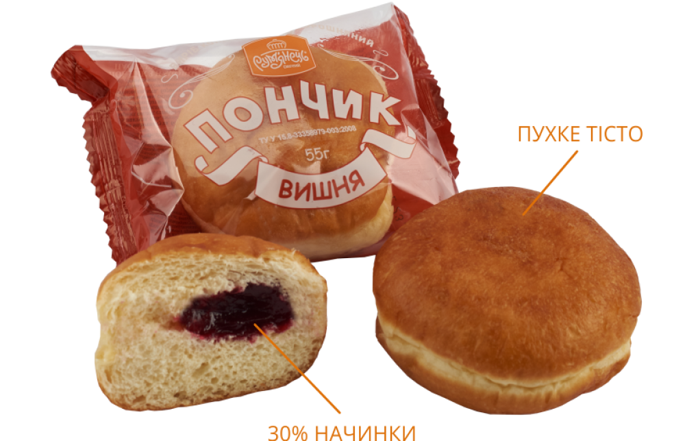 Склад: борошно пшеничне вищого сорту, наповнювач «Вишня», вода, рослинна олія «Fritex 15», яйця курячі, хлібопекарський поліпшувач, дріжджі, маргарин, цукор.