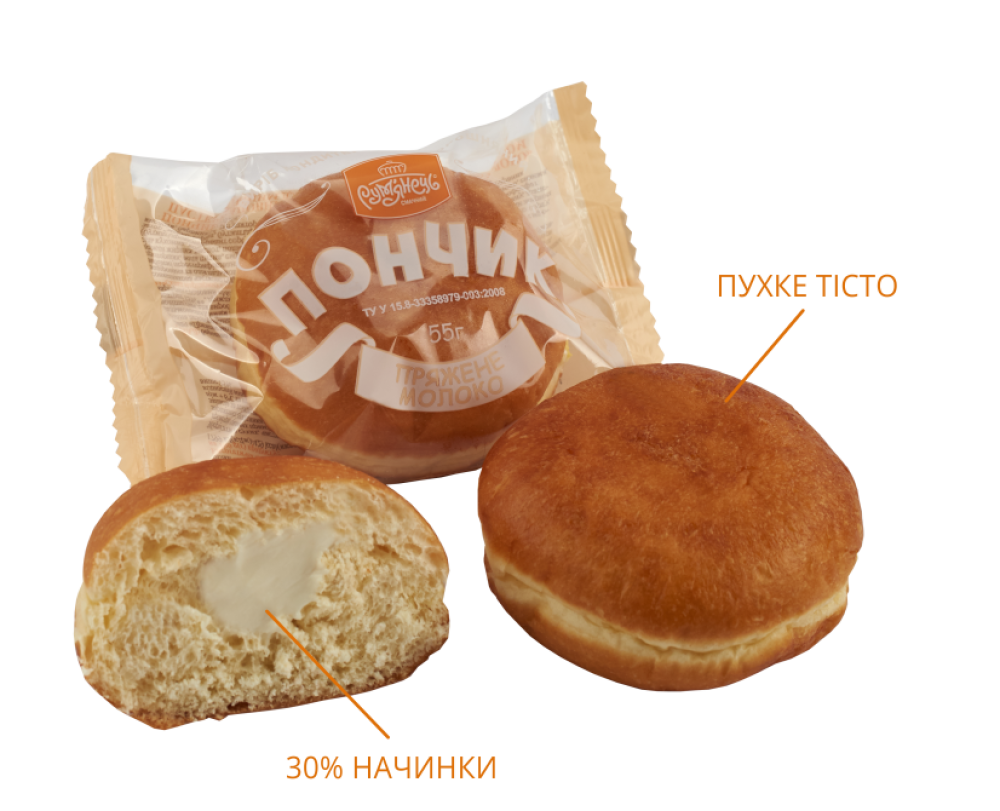 Склад: борошно пшеничне вищого сорту, наповнювач «Пряжене молоко», вода, олія соняшникова, яйця курячі, хлібопекарський поліпшувач, дріжджі, маргарин, цукор.