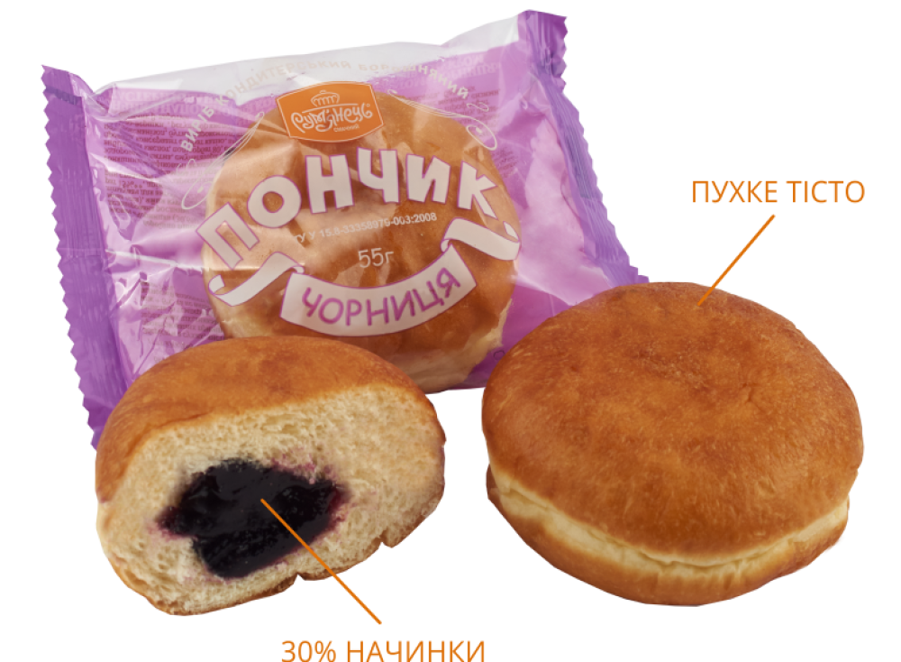 Склад: борошно пшеничне вищого сорту, наповнювач «Чорниця», вода, рослинна олія «Fritex 15», яйця курячі, хлібопекарський поліпшувач, дріжджі, маргарин, цукор.