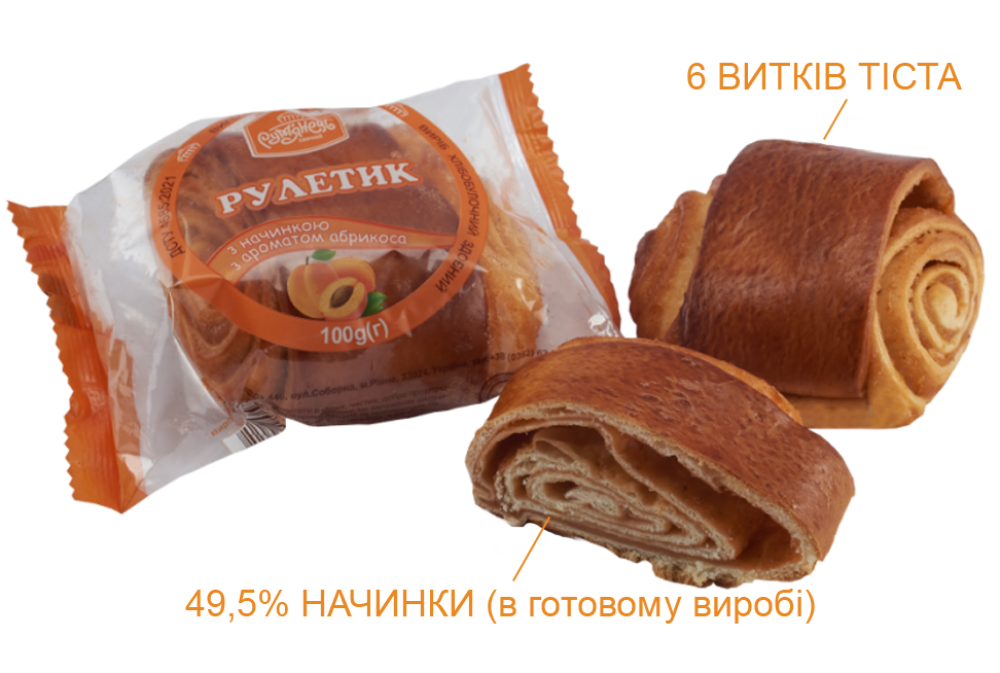 Рулетик з ніжного пухкого тіста з улюбленим фруктовим повидлом – класика смачної здоби. Родзинка смаколика – аромат абрикосу та свіженької випічки з легкими нотками ванілі, до якого просто не можна лишитись байдужим.