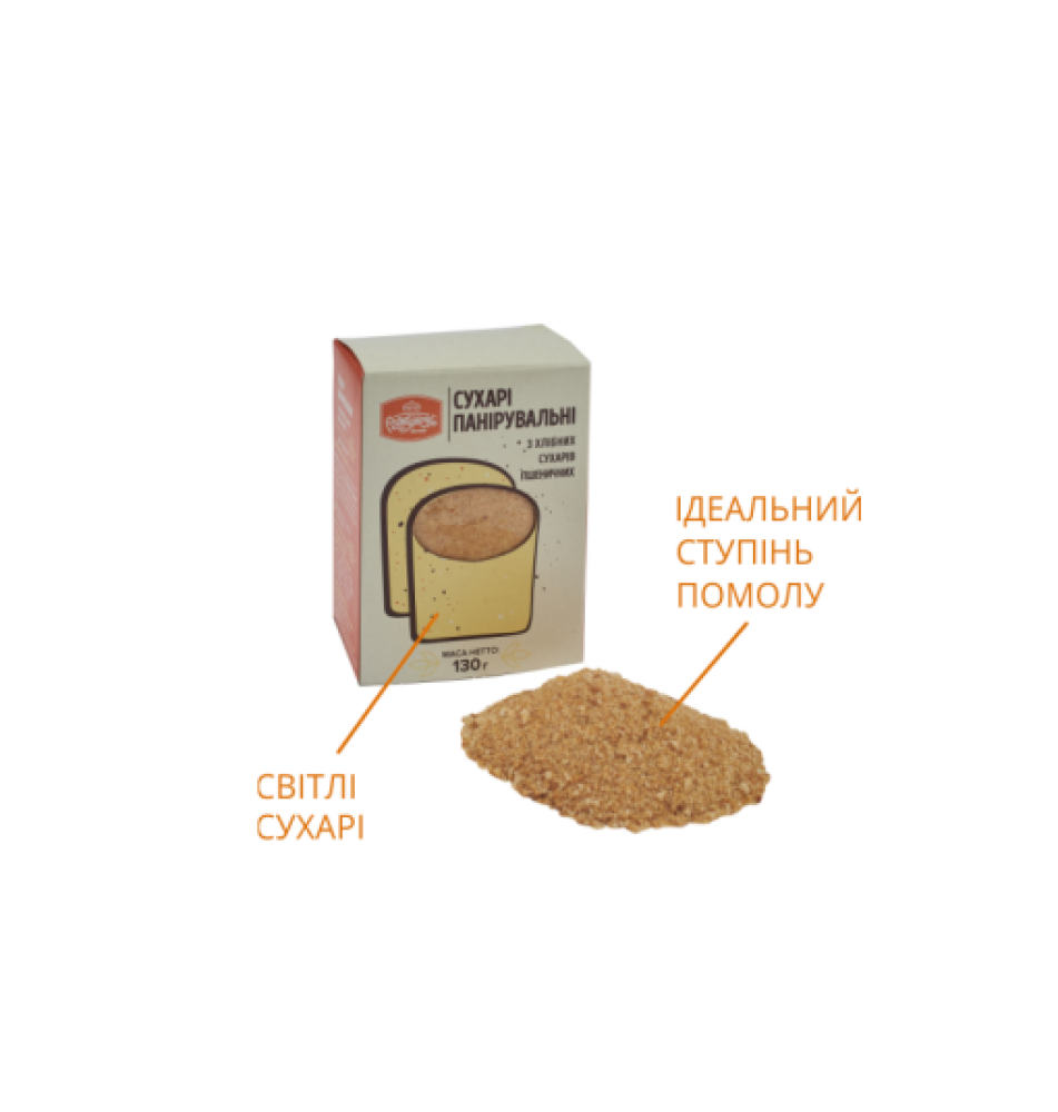 Пшеничні панірувальні сухарі відмінної якості. Завдяки ніжному пшеничному смаку ці сухарі не змінюють смаки приготованих страв. Ідеальний ступінь попелу дозволяє зробити рівномірне панірування, тож після обсмаження страви зберігають соковиту серединку та мають хрустку золотаву скоринку.