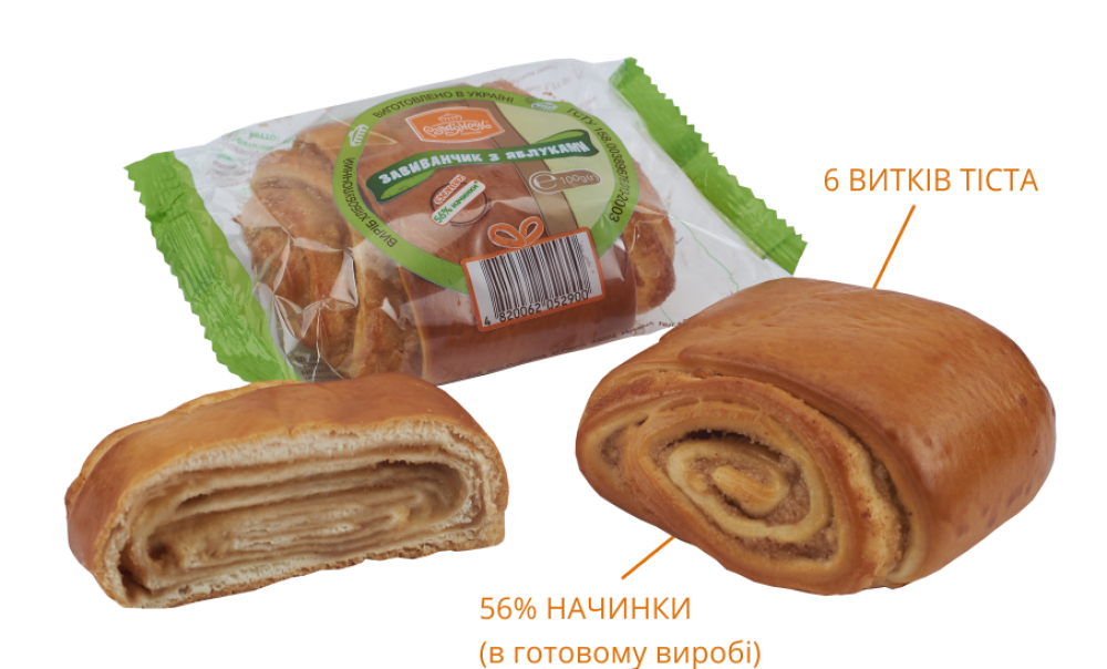 Склад начинки (64,1%): наповнювач «Яблуко», повидло яблучне, крупа манна, суміш харчова для зв'язування вологи, цукор.